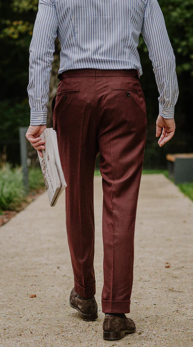 Burgundy melange flannel trousers with side adjusters, cut from 130s merino wool Rugby Flannel Collection, Drago Spa Mill, which has beautiful drape and combines a natural stretch performance with stain and water resistance. Inspired by traditional English bespoke flannel fabrics.