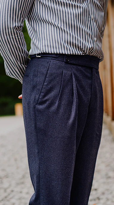 Barnaba II fit- flannel trousers with high rise and pleats. The leg is creased and gently tapered from the knee to the leg opening.