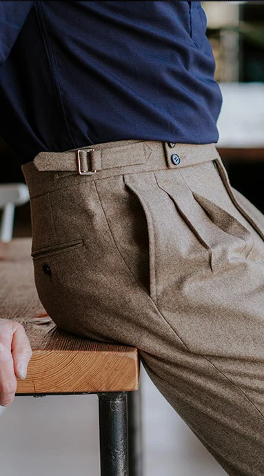 Pleated flannel trousers are crafted in classic Barnaba II fit. This is our signature gentleman fit which represents a classic silhouette with. These are high waist flannel trousers with double pleats. The leg is creased and gently tapered.Â