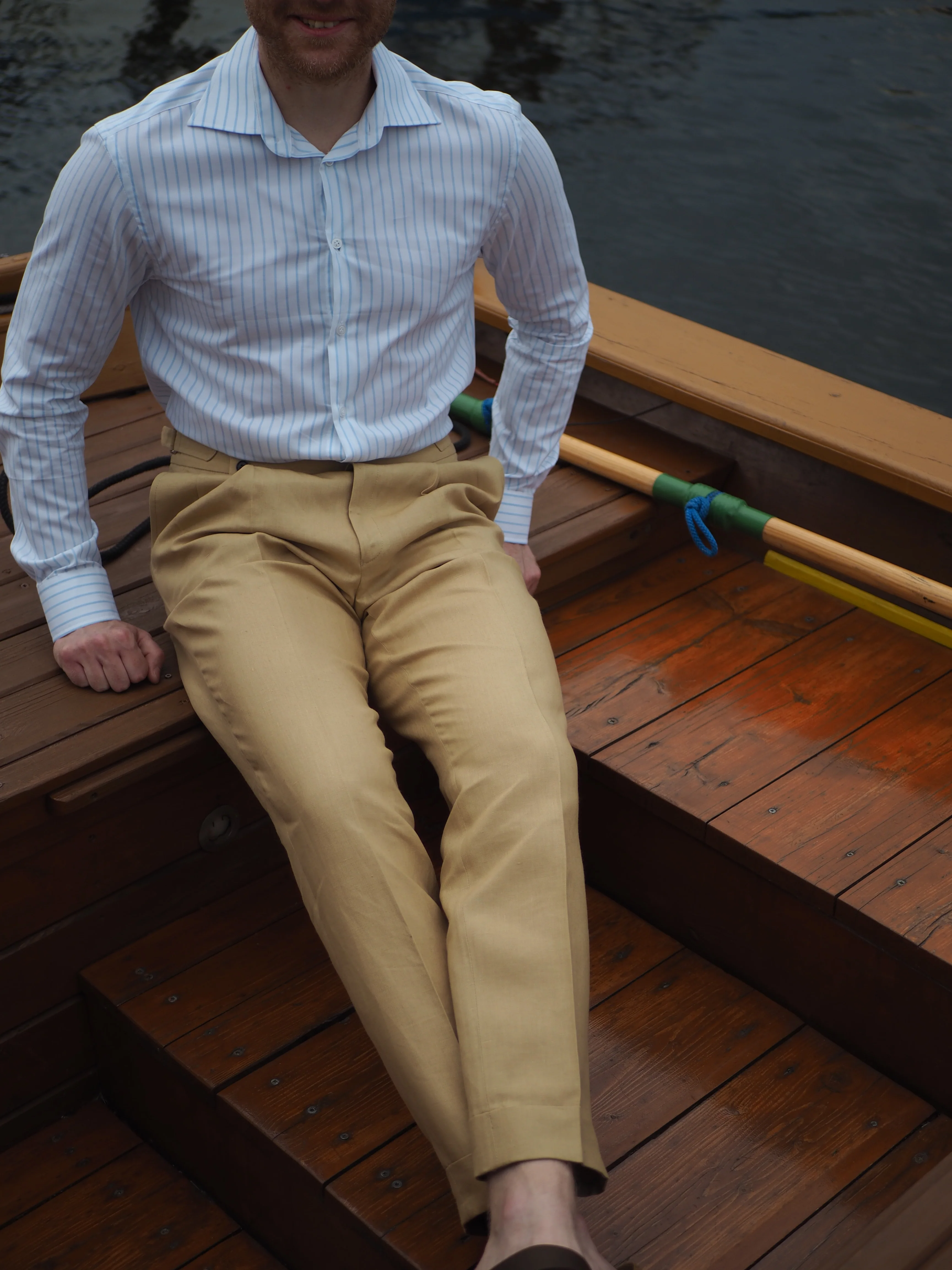 Double pleated linen trousers made from finest Irish linen from Spence Bryson in our signature Barnaba II fit with a high rise, wide two-button waistband, and side adjusters.